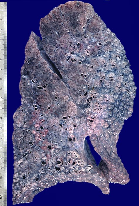 Aufgrund der Fibrose zeigt die Lunge an der Pleuraoberfläche ein honigwabenartiges Muster. Die Lichtungen der Bronchen sind deutlich erweitert.