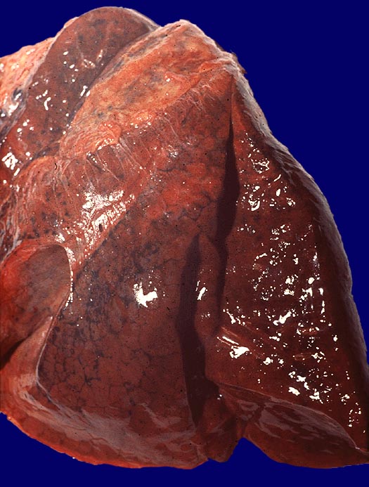 Der ganze Lungelappen ist rot blau verfärbt und hämorrhagisch. Die Pleuraoberfläche zeigt Verwachsungsstränge. Eine fibrinöse Pleuritis liegt nicht vor.
