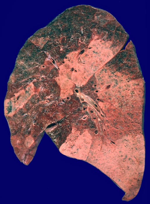Die Schnittfläche des Lungenunterlappens und grössere Areale des Oberlappens erscheinen homogen graugelb und stark verfestigt.
