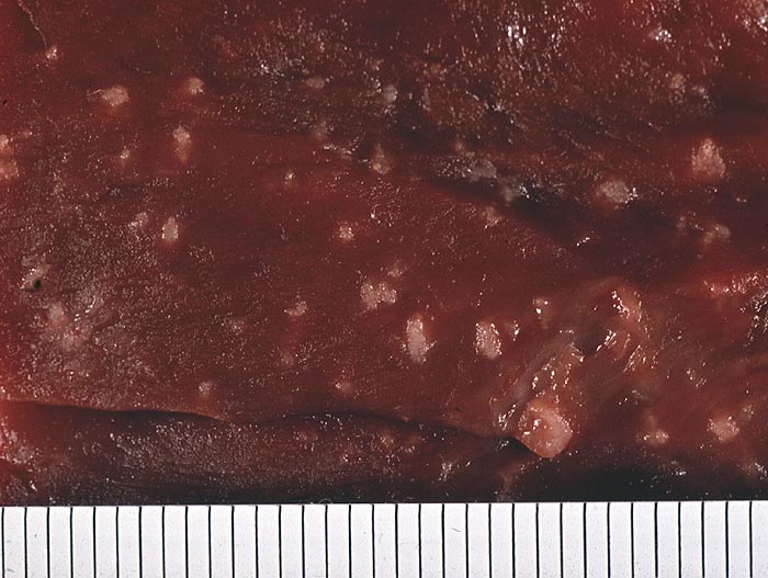 Speckig glänzendes Myokard mit prominenten Schnittkanten. Die weissen scharf begrenzten Punkte entsprechen Gefässanschnitten.
