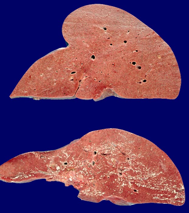 Amyloidose der Leber (oben), Normalbefund (unten)