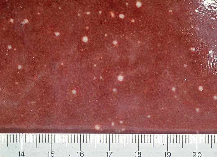 Multiple kleinste diffus verteilte weisse Knötchen (Granulome) sind an der Leberoberfläche sichtbar.