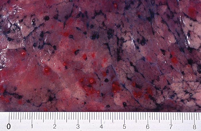 Multiple punktförmige gelbe Eiterherde umgeben von einem hämorrhagischen Randsaum.