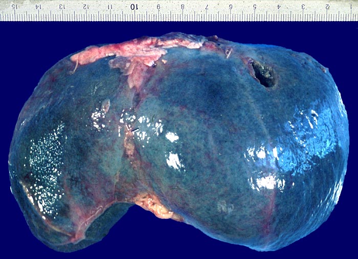Massiver Ikterus mit grünschwarzer Verfärbung der Leber infolge einer Gallenwegsatresie.