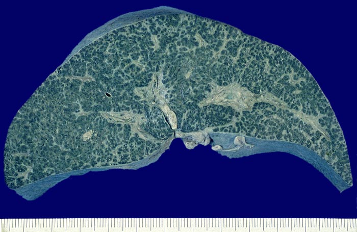 Massive Cholestase mit grüner Verfärbung der fixierten Leber infolge einer Gallenwegsatresie.