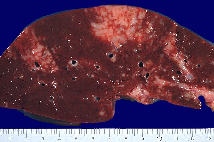 Die grobknotigen Infiltrate erinnern an eine Bauernwurst. Die Milz ist insgesamt deutlich vergrössert.