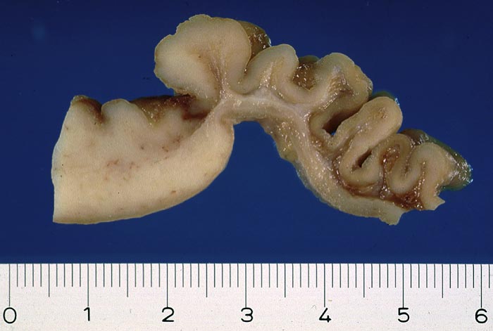 Links im Bild ist die Magenwand deutlich verdickt durch ein unscharf begrenztes weissgraues Lymphominfiltrat in sämtlichen Wandschichten bei intakter Schleimhaut. Die Magenwand rechts im Bild ist unauffällig.