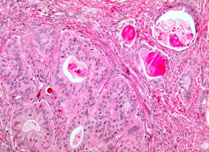 Rechts im Bild mehrere kolloidgefüllte Follikel der Struma ovarii. Links davon durch schmale Septen voneinander getrennte tubuläre Strukturen mit hochprismatischem Epithel und monomorphen kleinen runden bläschenförmigen Kernen mit feinem Chromatin und kleinen Nukleolen.