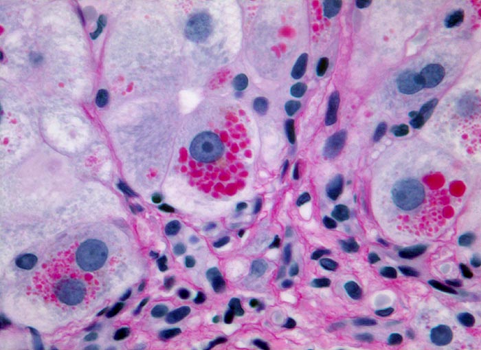 Nach Diastase Vorbehandlung enthalten die periportalen Hepatozyten zahlreiche kugelige rote zytoplasmatische Einschlüsse, welche immunhistochemisch alpha-1-Antitrypsin entsprechen.