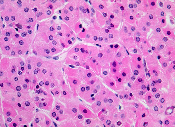 Monomorphe kubische onkozytäre Tumorzellen mit runden blanden Kernen. Viel eosinophiles feingranuläres Zytoplasma.