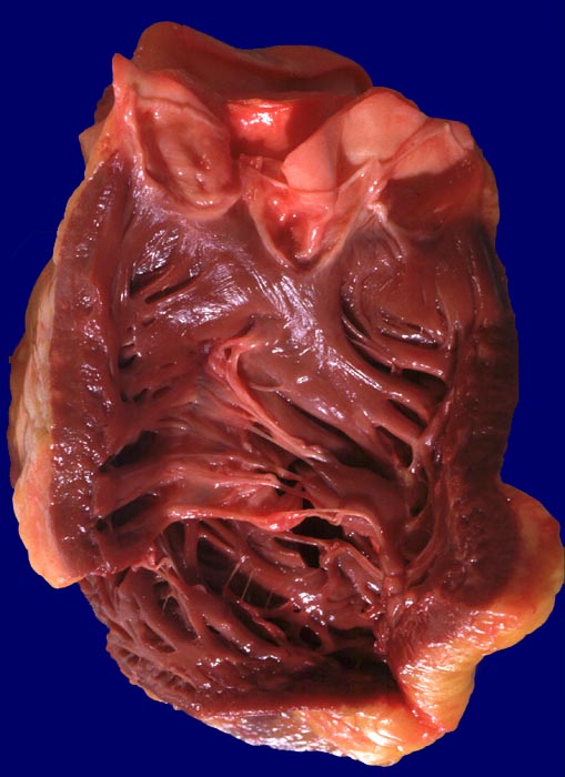 Stark verdicktes rechtsventrikuläres Myokard mit geringer Ausweitung der Herzkammer (konzentrische Hypertrophie)