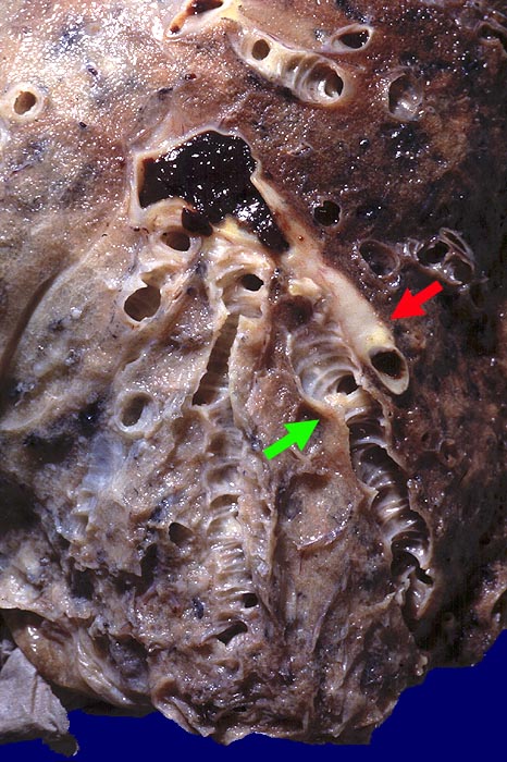 Bronchiektasen in Unterlappen und basalen Oberlappen. Pneumonie beidseits. Cor pulmonale.