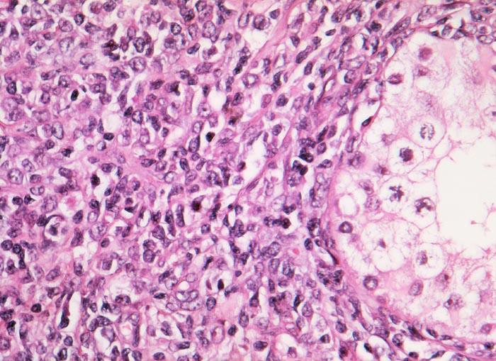 Rechts im Bild der Anschnitt eines erhaltenen Hodentubulus. Im Interstitium ein diffuses Infiltrat von mittelgrossen bis grossen Lymphomzellen mit grossen blasigen Kernen und teilweise prominenten Nukleolen.