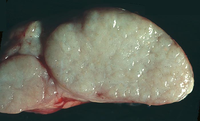 Vergrösserter Lymphknoten mit weisser glänzender fein lobulierter Schnittfläche.