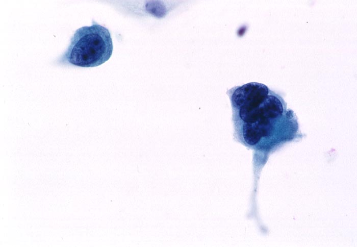Zwei hochgradig atypische Urothelzellen mit unreifem Zytoplasma, eine davon mit mehreren atypischen Kernen.