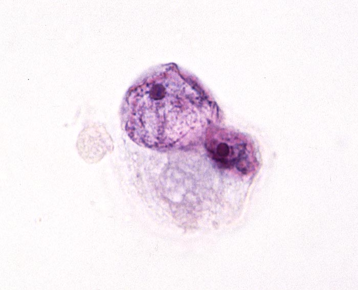 Ggrossleibige Zelle mit vesikulärem grobstrukturiertem Kern und auffallend plumpen Nukleolen. Der Zytoplasmaleib ist abgerundet und schaumig strukturiert.