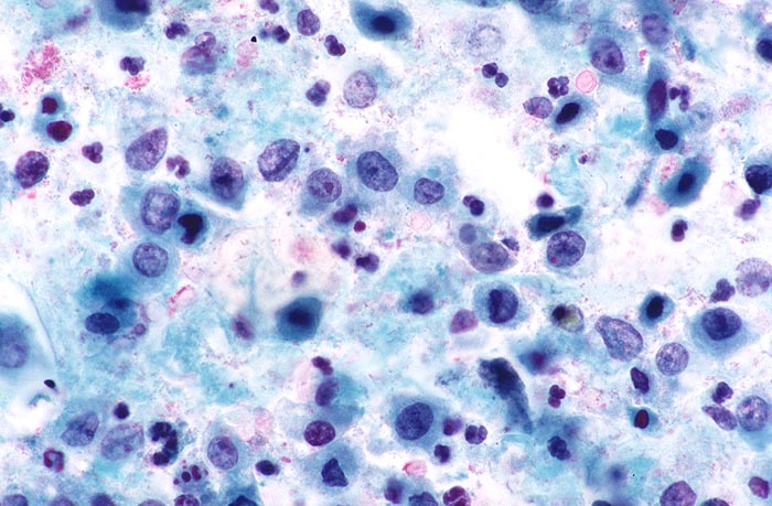 Neben Detritus und Erythrozyten zahlreiche atypische Urothelien. Die Kerne der Urothelien sind unterschiedlich gross und unterschiedlich geformt, grobstrukturiert. Nukleolen meist wenig hervortretend, zum Teil aber deutlich verplumpt. Zytoplasma nur mässig ausgereift .