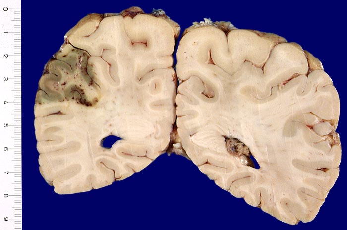 Frischere anämische Enzephalomalazie mit sekundären Einblutungen