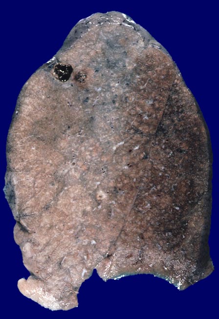 Der Lungenunterlappen ist aufgrund verstärkter Blutfülle braunrot verfärbt. Der zystische hämorrhagische subpleural gelegene Herd im Oberlappen entspricht einem alten abgebauten hämorrhagischen Lungeninfarkt.