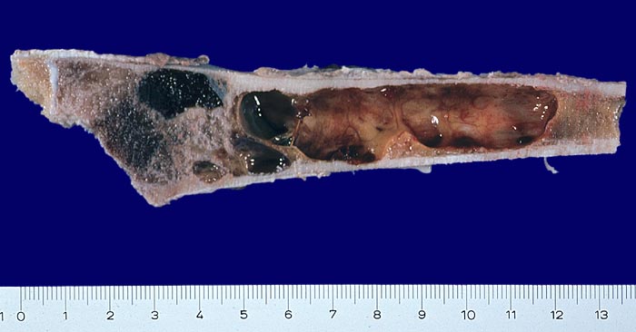 wechselnd grosse blutgefüllte Hohlräume umschliesst. Die Kortikalis ist durch den expansiv wachsenden zystischen Prozess stellenweise verdünnt.