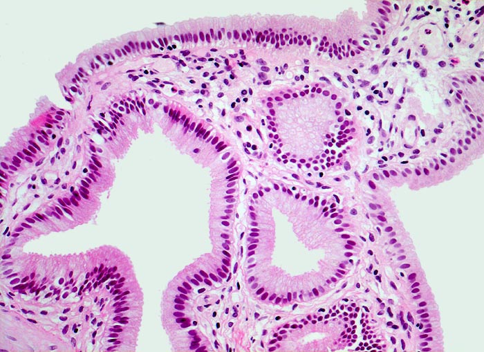 Die Gallenblasenschleimhaut bildet unregelmässige Falten, die bedeckt sind von einem hochzylindrischen Epithel, dessen Kerne basalständig angeordnet sind. In der Lamina propria findet sich ein lockeres Infiltrat von Lymphozyten und Plasmazellen (minimale chronische Entzündung).