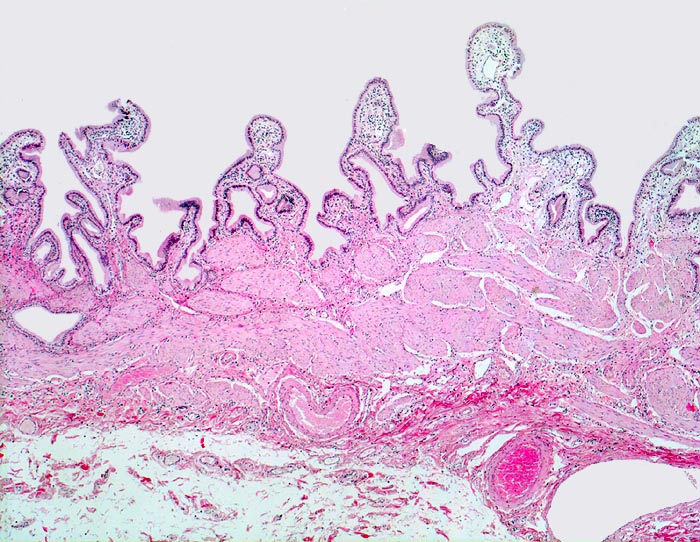 Die Gallenblasenschleimhaut bildet unregelmässige Falten, die bedeckt sind von einem hochzylindrischen Epithel. Unterhalb der Mukosa eine dicke Schicht glatter Muskulatur. Anders als in anderen Hohlorganen des Gastrointestinaltrakts fehlen eine Lamina muscularis mucosae und eine Submukosa. Unterhalb der Muskelschicht das lockere gefässführende Bindegewebe der Subserosa.