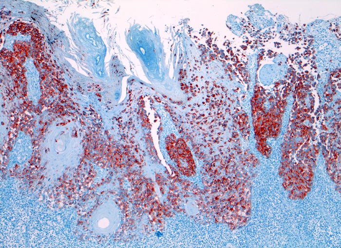 Die Melanomzellen färben sich an mit dem Melanommarker HMB-45. Dabei wird die Ausdehung der Tumorzellinfiltrate deutlich. An der Oberfläche sind die Zellen diskohäsiv.