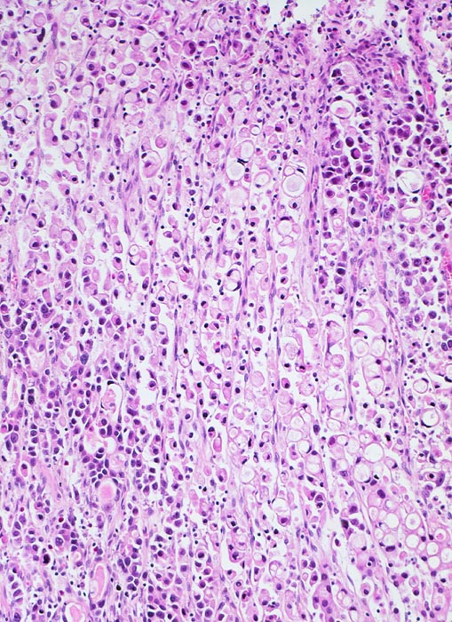 Der Tumor besteht zu einem Grossteil aus Siegelringzellen mit unterschiedlich grossen Schleimvakuolen, die den Kern zur Seite drängen. Links unten im Bild bilden die Tumorzellen kleine Drüsenschläuche.