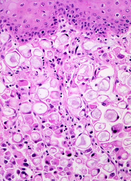 Der Tumor besteht praktisch ausschliesslich aus Siegelringzellen mit unterschiedlich grossen Schleimvakuolen, die den Kern zur Seite drängen.
