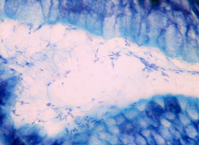 Im Schleim auf der Mukosaoberfläche finden sich zahlreiche schlanke, leicht gekrümmte Bakterien.