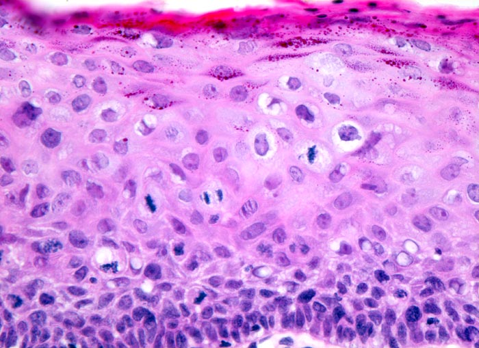 Metaplastisches Plattenepithel der Portio. Vergrösserte leicht hyperchromatische Kerne und Mitosen bis auf halbe Epithelhöhe. Weitgehend erhaltene Architektur. Die oberste Epithelschicht zeigt Einlagerungen von Keratohyalingranula. In der obersten abgeflachten Schicht sind noch Zellkerne erkennbar.