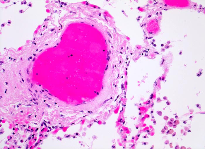 Die Wand der abgebildeten Vene ist aufgrund der Mediahypertrophie deutlich verdickt. Die Kapillaren in den Alveolarsepten treten aufgrund der starken Blutfülle deutlich hervor (akute Stauung). Zahlreiche siderinhaltige braune Alveolarmakrophagen in den Alveolarräumen.