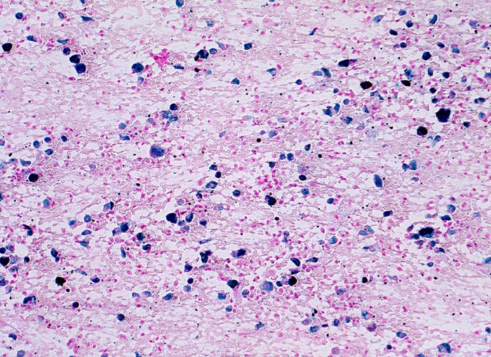 Im Sputumausstrich sind in der Eisenfärbung zahlreiche Makrophagen erkennbar, die eisenhaltiges Hämosiderin enthalten.