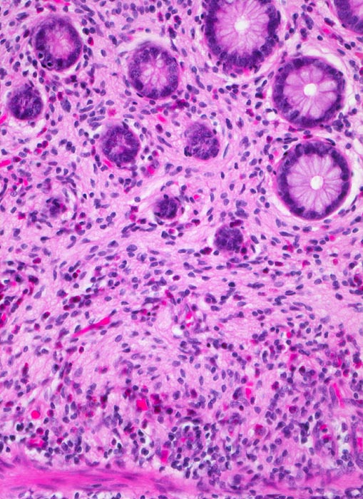 Zwischen den Kolonkrypten, diese teilweise ersetzend proliferieren Schwann Zellen.