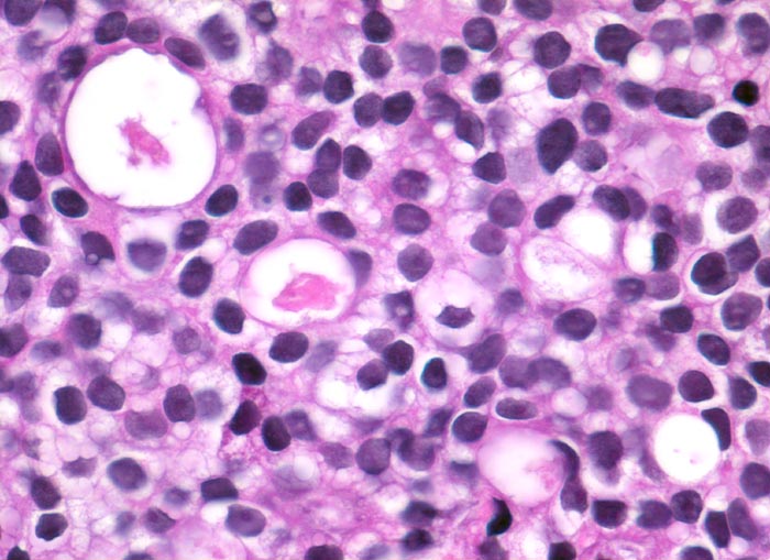 Monomorpher kribriformer Tumor bestehend aus kleinen Tumorzellen mit rundlichen Kernen mit promimenten Nukleolen.