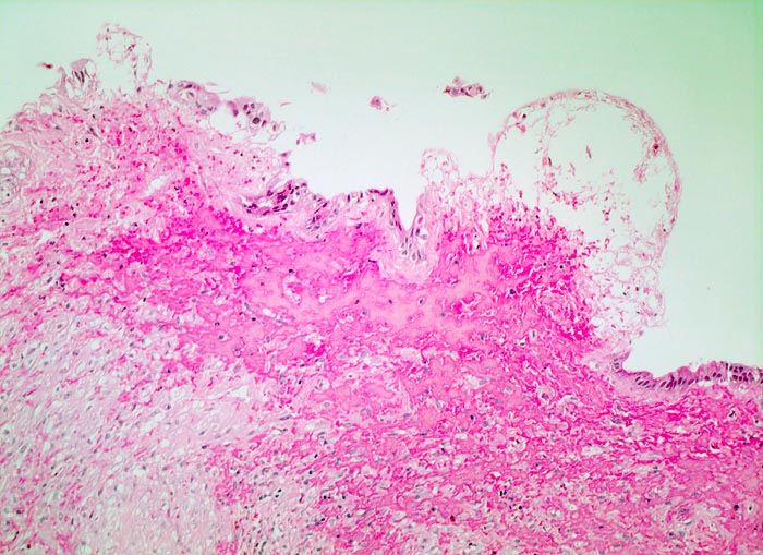 Das Schleimhautrelief ist abgeflacht. Steineindruckstelle mit druckbedingtem Ulkus mit Ablagerung von Fibrin und Einblutung im Ulkusgrund.