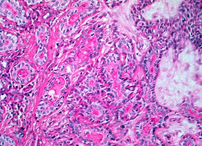 Epitheliale Gangstrukturen ausgekleidet lumenwärts von einem einschichtigen kubischen Epithel und einer äusseren Myoepithelschicht. Die Myoepithelien bilden stellenweise solide $o{qy8062494Myoepithelien} Zellmassen. Wenig mukoides Stroma. Die Drüsen sind ausgekleidet von kubischem Epithel und enthalten homogene hyaline Massen.