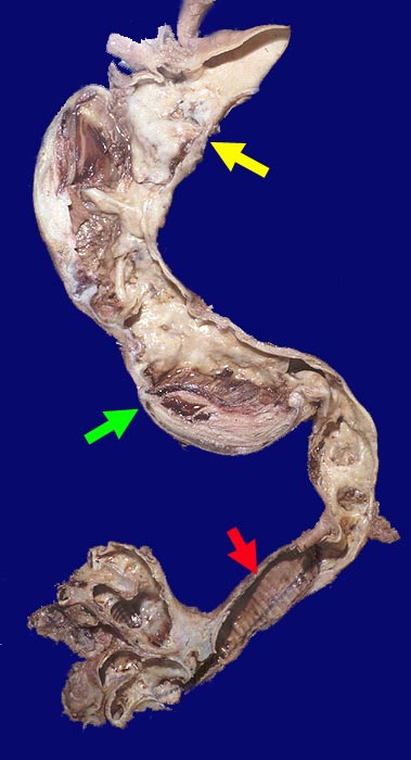 Formalinfixierte Aorta längs halbiert: ► Y-Graft der Bauchaorta. Spindelförmiges, partiell thrombosiertes atherosklerotisches Aneurysma verum des ► Aortenbogens und der ► Aorta descendens.