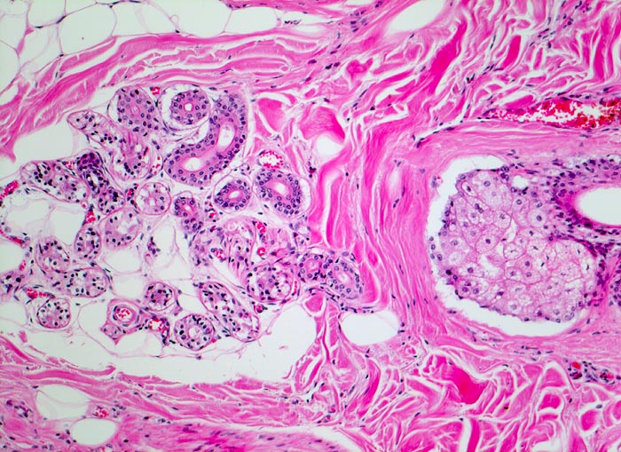 An der Grenze von Dermis zur Subkutis. Rechts im Bild eine Talgdrüse. Links im Bild eine ekkrine Schweissdrüse.