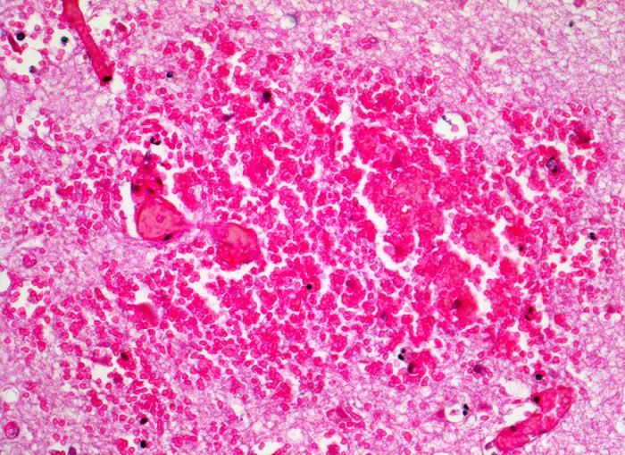 Gefäss mit partiell aufgelöstem Thrombembolus. Infolge der Reperfusion des geschädigten Gefässes kommt es zum Blutaustritt ins Parenchym.
