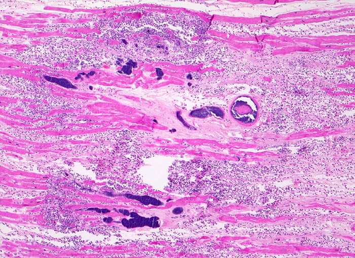 Das nekrotische hypereosinophile Myokard wird infiltriert von neutrophilen Granulozyten. Die unregelmässig begrenzten blauen Flecken entsprechen Bakterienhaufen, welche teilweise intravaskulär lokalisiert sind.
