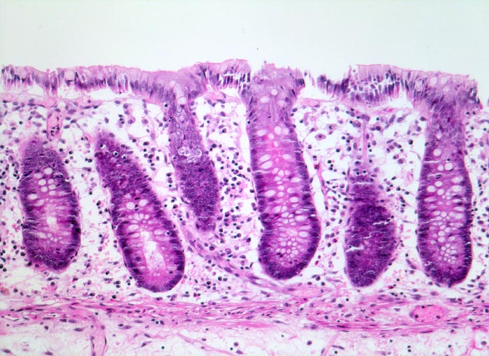 Normale Kolonschleimhaut mit lockerem Entzündungsinfiltrat (Plasmazellen, Lymphozyten, Histiozyten und eosinophile Granulozyten) im Stroma und parallel ausgerichteten Krypten. Die Anzahl Becherzellen ist diskret vermindert. Das Epithel erscheint deswegen leicht basophil.