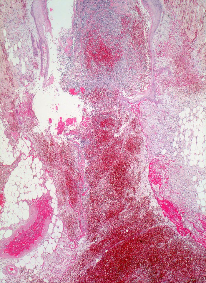 Spaltförmiger Defekt des Plattenepithels, der sich fortsetzt in die darunterliegende Cutis und obere Subcutis, mit spaltförmigem Defekt der Bindegewebsfasern. Am Rand des Defektes