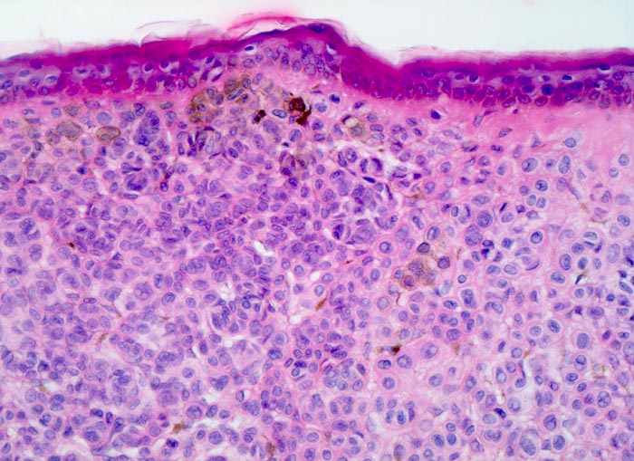 Dünne Epidermis ohne Infiltrate von Naevuszellen. Die Naevuszellen im Corium bilden dichtliegende Zellballen. Vor allem in den oberflächlichen Naevuszellen lässt sich braunes Melaninpigment nachweisen.