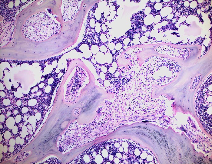Spongiosabälkchen mit tiefen Resorptionslakunen, welche die Bälkchen z.T. tunnelartig aushöhlen. In diesen Lakunen zahlreiche Osteoklasten mit 5-10 Kernen/Schnittebene. Parallel zur Spongiosaoberfläche erkennbare endostale Faservermehrung sowie vermehrt Fibroblasten.