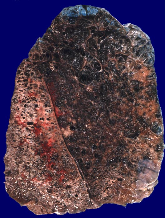 Die Lunge weist verschieden grosse Löcher auf, die den zentralen Lobulusabschnitten entsprechen. Im destruierten Lobuluszentrum ausgeprägte Anthrakose. In den apikalen Abschnitten Endstadium (Emphysem des leeren Lobulus) mit vollständiger Zerstörung der Parenchymstrukturen innerhalb der einzelnen Lobuli.