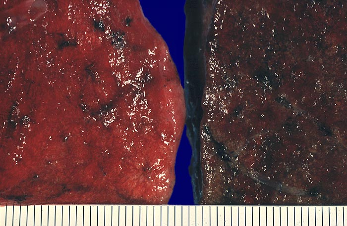 Die Vergleichslunge links zeigt im Frischzustand eine normale rötliche Farbe. Die chronisch gestaute Lunge ist aufgrund von massiven Hämosiderinablagerungen (in Alveolarmakrophagen) braun verfärbt.