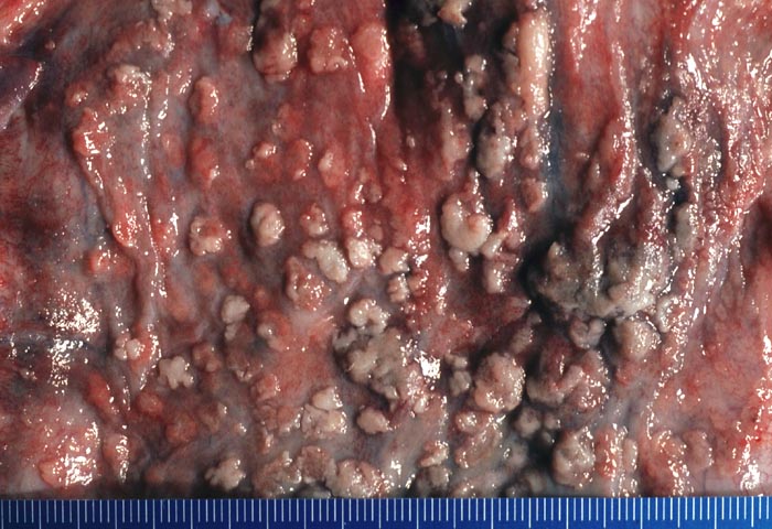 Der entzündlich hyperämischen Kolonschleimhaut sind zahlreiche graue unregelmässig begrenzte Pseudomembranen aufgelagert.