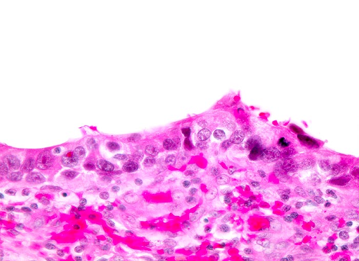 Verschmälertes Urothel. Deutlich ausgeprägte Zellkernpolymorphie. Starke Vergösserung der hyperchromatischen Kerne mit Verschiebung der Kern-Zytoplasmarelation.