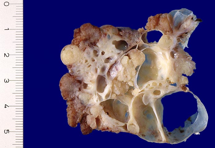 Multilokulärer zystischer Tumor mit blumenkohlförmigen Tumorproliferaten an der Zysteninnen- und aussenoberfläche.